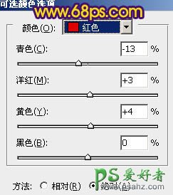 8、创建可选颜色调整图层,对红,黄进行调整,参数设置如图13,14,效果如图15。