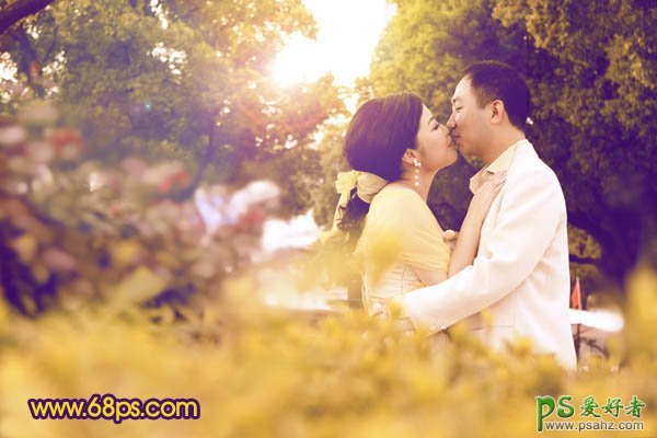 PS给温馨浪漫的公园情侣热吻照片调出暖洋洋的效果