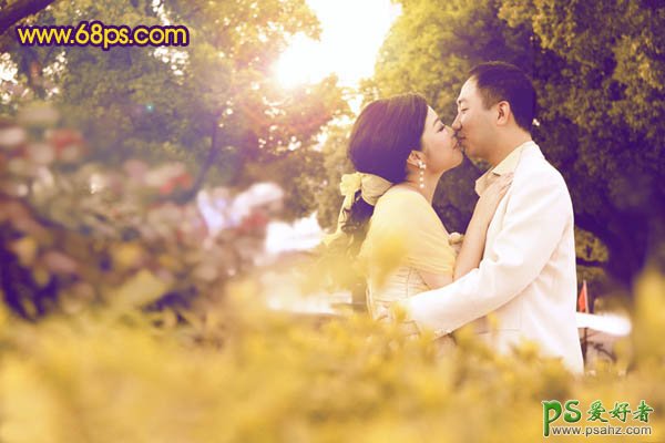 PS给温馨浪漫的公园情侣热吻照片调出暖洋洋的效果