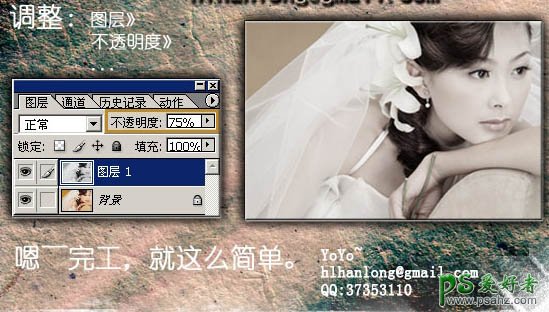 4、把刚才得到的黑白图层不透明度改为:75%,基本完成操作。如果人物部分有噪点的话,可以新建一个图层盖印图层后适当给人物磨皮处理。