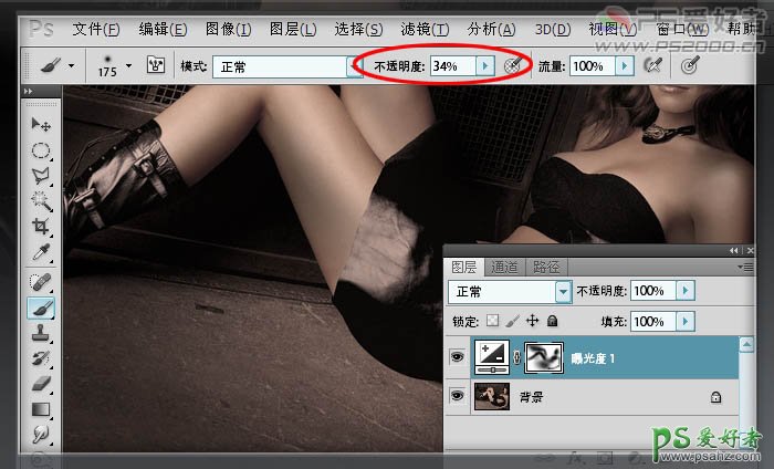 左上方射入。选择柔性画笔,不透明度34%左右,前景色为黑色,在图层蒙版上涂出人像高光部位。