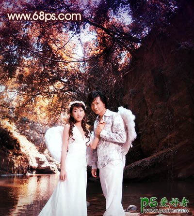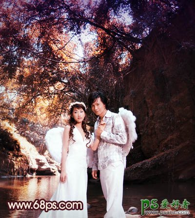PS调色教程:给外景天使情侣婚片调出黄褐色效果