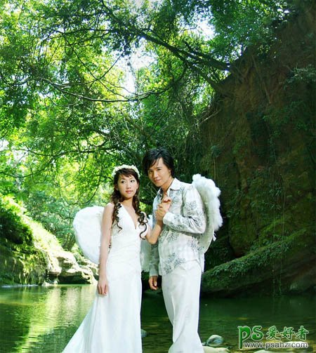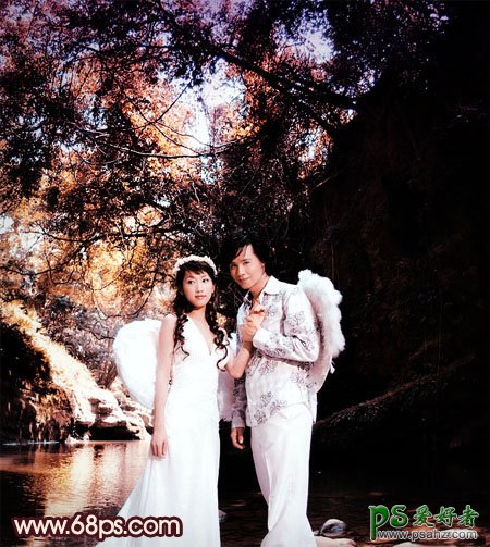 今天我们来学习一篇PS婚片后期调色教程实例,PS调色教程:给外景天使情侣婚片调出黄褐色效果,看上去很有艺术感,本教程介绍暗调婚片的调色方法。大致过程:调色之前先把图片的色调压暗一点,然后用调色工具把主色调成自己想要的颜色。后期再适当加上暗角并调整下大致明暗关系即可。