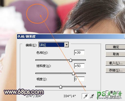 2、创建色相/饱和度调整图层,选择洋红,用吸管吸取人物后面紫色沙发的颜色,然后调整,参数设置如图6,效果如图7。