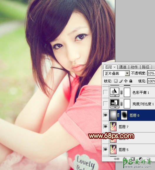 7、新建一个图层,选择渐变工具,颜色设置为黑白,有中心向四周拉出径向渐变。确定后把图层混合模式改为“正片叠底”,图层不透明度改为:10%,加上图层蒙版,用黑色画笔把人物脸部擦出来,如下图。