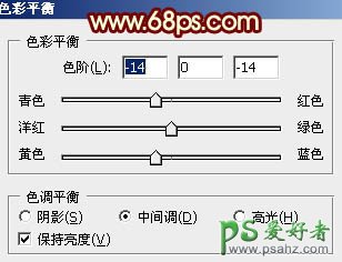 8、创建色彩平衡调整图层,稍微把色彩调匀一点,参数设置如图14,效果如图15。