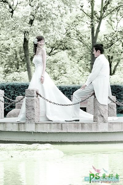 PS调色教程:给夏日青绿色婚片调出冬景色彩