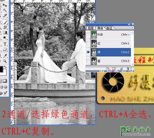 2、进入通道面板,选择绿色通道,按Ctrl + A 全选,按Ctrl + C 复制。