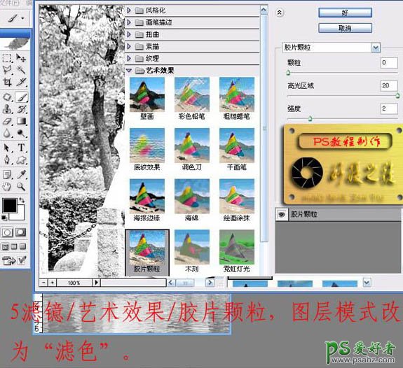 5、对图层2执行:滤镜 > 艺术效果 > 胶片颗粒,参数设置:颗粒:0;高光区域:20;强度:2。如下图。确定后把图层混合模式改为“滤色”。
