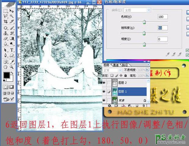 6、回到“图层1”,对“图层1”执行:图像 > 调整 > 色相/饱和度,参数设置:180/50/0。勾选下面的着色选项,效果如下图。