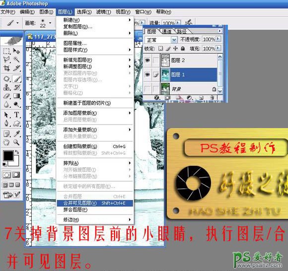7、关掉背景图层前的小眼睛,把背景图层影藏。选择菜单:图层 > 合并可见图层(把背景以外的图层都合并)。