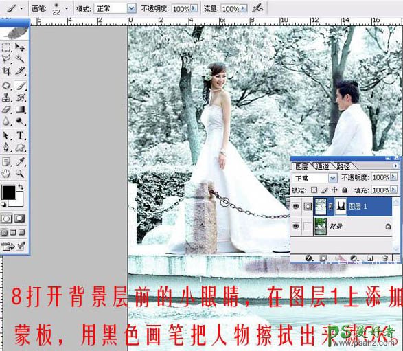 8、打开背景图层前的小眼睛,把背景显示出来。回到“图层1”(即刚才合并后的图层),加上图层蒙版,用黑色画笔把人物部分擦出来,完成最终效果。