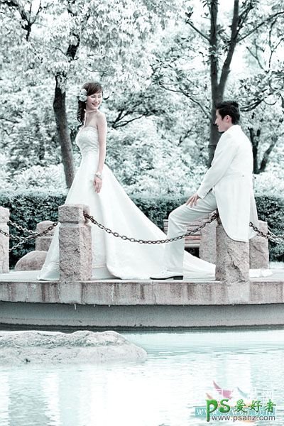 今天我们和大家一起来学习一篇PS婚片后期调色教程实例,PS调色教程:给夏日青绿色婚片调出冬景色彩,本教程介绍非常实用的外景人物调色方法。过程非常简单:先把背景图层复制一层,在通道中把像素较好的通道复制到图层面板中,然后用滤镜加上一些纹理后把图层混合模式改为“滤色”,这样画面就明亮很多。后期再用色相/饱和度调出想要的单色调。再把人物部分单独润色即可。