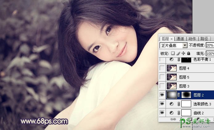 8、新建一个图层,选择渐变工具,颜色设置为黑白,由中心向四周拉出径向渐变。确定后把图层混合模式改为“正片叠底”,图层不透明度改为:20%,加上图层蒙版用黑色画笔把中间部分擦出来,如下图。