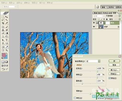 4、执行:图象/调整/通道混合器,在红色通道里,红色+100;绿色+98;蓝色-114,如下图。
