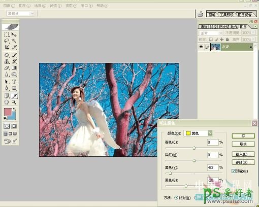 7、人物皮肤调整:先修掉肤色上的瑕疵,再打开图象/调整/可选颜色,在黄色通道里减黄,减黑,直到人物的肤色变的白里透红!