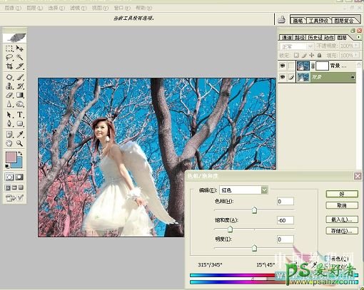 8、复制图层,点击最下面的图层,然后打开色相饱和度,在红色通道里降低饱和度!最后在最上面的图层里加蒙版,用画笔工具将树枝大概擦出来!记得是树枝不是树叶!