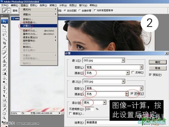 2、选择菜单:图像 > 计算,具体参数设置如下图。