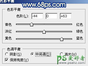 5、调出当前图层蒙版选区,创建色彩平衡调整图层,把背景调蓝一点,参数设置如图14,效果如图15。