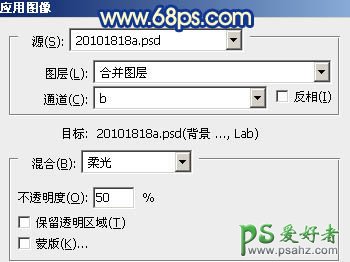 6、新建一个图层,按Ctrl + Alt + Shift + E 盖印图层。选择菜单:图像 > 模糊 > Lab颜色,在弹出的对话框选择“不拼合”,然后选择菜单:图像 > 应用图像,参数设置如图16,效果如图17。