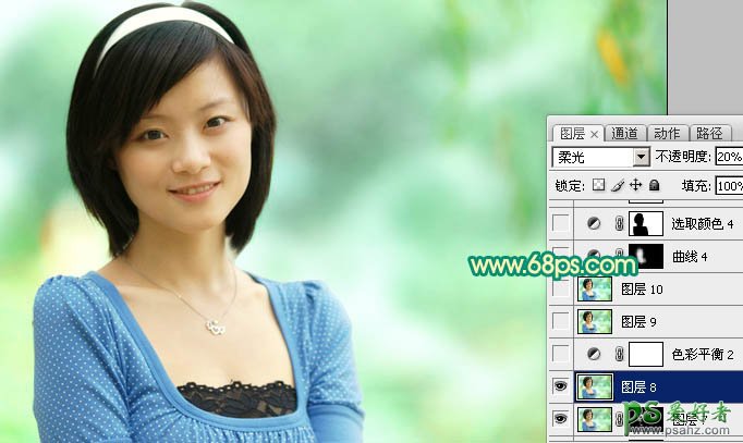 13、新建一个图层,按Ctrl + Alt + Shift + E 盖印图层,执行:滤镜 > 模糊 > 高斯模糊,数值为5,确定后把图层混合模式改为“柔光”,图层不透明度改为:20%,如下图。
