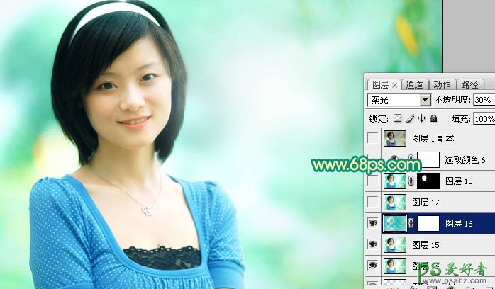 19、按Ctrl + Alt + ~ 调出高光选区,新建一个图层填充颜色:#0DC1BA,图层混合模式改为“柔光”,图层不透明度改为:30%,效果如下图。