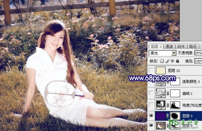 11、新建一个图层,填充颜色:#32096F,图层混合模式改为“柔光”,图层不透明度改为:25%,加上图层蒙版,用黑色画笔把中间部分擦出来,效果如下图。