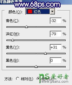 4、再创建可选颜色调整图层,对红,黄,进行调整,参数设置如图8 - 9,确定后用黑色画笔把人物部分擦出来,效果如图10。