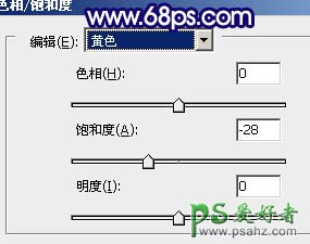 5、创建色相/饱和度调整图层,选择黄色,再用吸管吸取背景颜色调整,参数设置如图11,效果如图12。