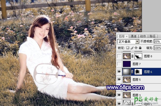 8、新建一个图层,用黑白渐变拉出白色至黑色径向渐变,把图层混合模式改为“正片叠底”,图层不透明度改为:20%,加上图层蒙版,用黑色画笔把人物及周围部分擦出来,给照片加上暗角,效果如下图。