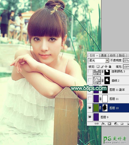 12、新建一个图层,填充深绿色:#4B7511,图层混合模式改为“柔光”,不透明度改为:20%,加上图层蒙版,用黑色画笔把中间部分擦出来,效果如下图。