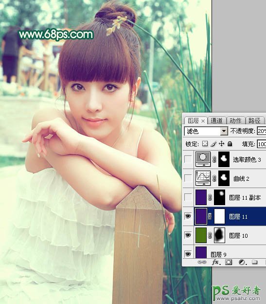 13、新建一个图层,填充颜色:#3B1175,图层混合模式改为“滤色”,不透明度改为:20%。
