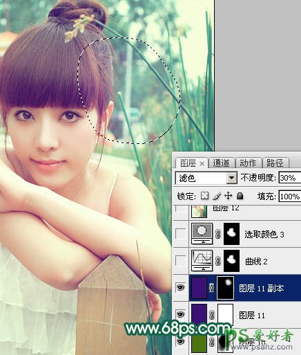 14、把当前图层复制一层,图层混合模式为“滤色”不变,不透明度改为:30%,按住Alt键添加图层蒙版,用白色画笔把下图选区部分擦出来。