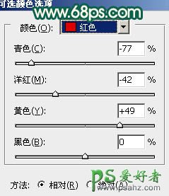 2、创建可选颜色调整图层,对红,黄,绿,青,白,中性色进行调整,参数设置如图2 - 7确定后用黑色画笔把人物脸部及肤色部分擦出来,这一步主要是调背景颜色,如果觉得浓度还不够可以把当前图层复制一层,适当降低图层不透明度,效果如图8。