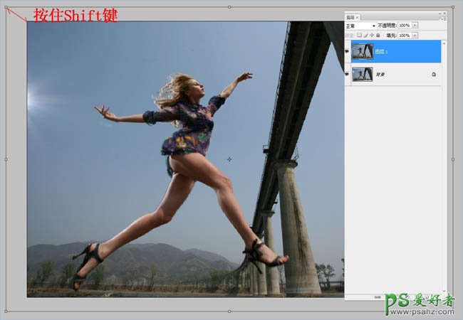 2、调整画面构图,调整画面的构图,使用快捷键“Ctrl+T”,并按住Shift键扩大图片,从而突出人物。调整后,还要对人物的皮肤进行调整。