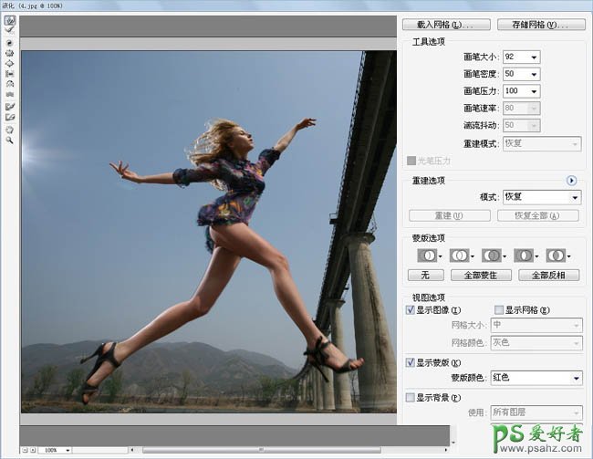 3、调整人物的身材,使用“液化”工具修饰模特的腿和身材。在修饰时,要放大画面,并且不要修得太过,否则会显得很假,很不舒服。 注意:在进行这类照片的修饰时,由于人物是在运动中的,所以在进行液化的时候要根据肌肉的形态进行修饰。