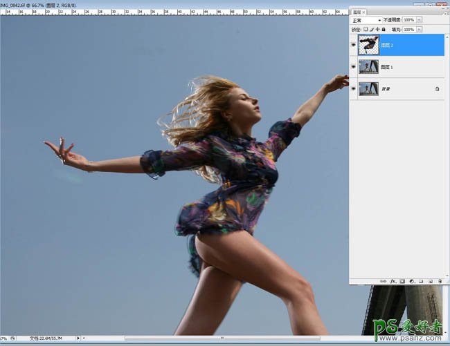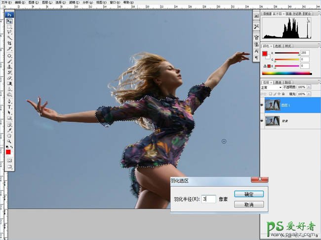 4、抠出人物的服装,用快速选取工具把人物的服装选出来,并进行适当的羽化处理,以保证调整的时候过渡自然。使用快捷键“Ctrl+J”复制选区内的图像。