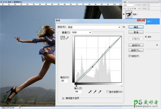 7、调整人物肤色,使用“曲线”工具调整人物高光位置和暗部的层次。对于这张照片来说稍稍提亮高光部分的亮度,压暗暗部区域,使人物的轮廓线更加明显。然后使用“色相/饱和度”工具调整人物的肤色,稍稍降低画面的饱和度,使人物肤色感觉健康、阳光。