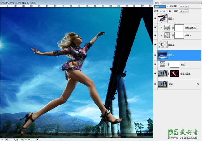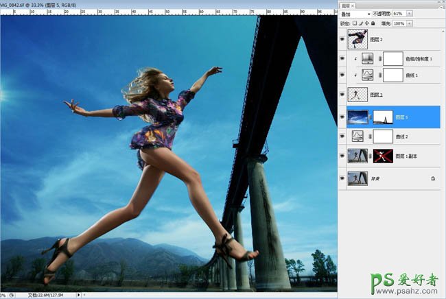11、为素材图层建立蒙版,将除天空以外的部分包括:大桥和背景中的树擦出来即可。