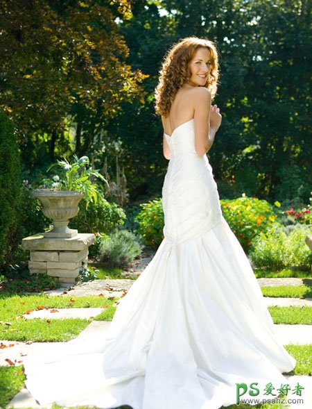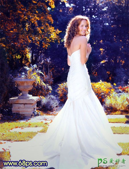 PS婚片后期调色实例教程,PS调色教程:给漂亮欧美少女婚纱照调出深蓝的秋季色,本教程主色以深蓝色为主,人物及背景树叶部分加上了一些橙色调。有种冷暖对比的感觉。大致的调色过程:前期需要把色调层次分开,较暗的部分都调成蓝色,高光区域则调成橙黄色。看上去有种秋意即可。
