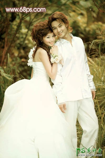 今天我们教大家学习一篇PS婚片后期调色教程实例,本教程介绍较为少见的淡褐色图片调色方法。大致过程:调色的时候先用渐变映射调出褐色的底色,然后在Lab模式下给人物加上甜美色,后期再适当加上一些补色,暗角和高光即可。 最终效果 原图 1、打开