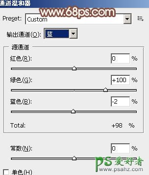 14、创建通道混合器调整图层,对蓝色进行调整,参数设置如图30,确定后把图层不透明度改为:20%,效果如图31。