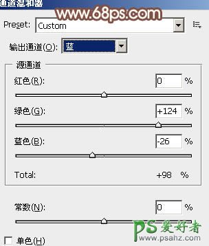16、创建通道混合器调整图层,对蓝色进行调整,参数设置如图33,确定后把图层不透明度改为:30%,效果如图34。
