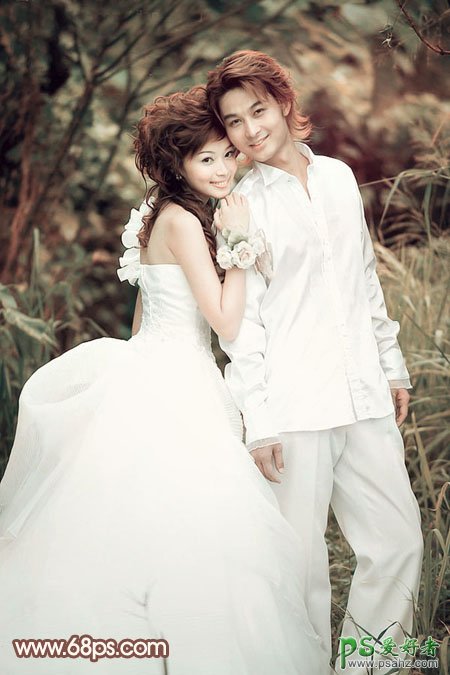 今天我们教大家学习一篇PS婚片后期调色教程实例,本教程介绍较为少见的淡褐色图片调色方法。大致过程:调色的时候先用渐变映射调出褐色的底色,然后在Lab模式下给人物加上甜美色,后期再适当加上一些补色,暗角和高光即可。