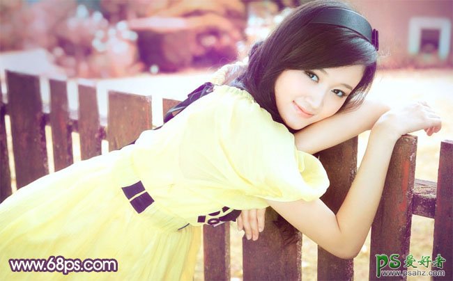 PS美女照片调色实例教程,PS调色教程:给可爱的小美妞调出淡黄色效果,原图素材色调非常不错。只是周围及衣服部分的颜色太艳丽,人物部分显得有点暗。处理的时候把人物部分稍微调亮一点,再根据自己的喜好调出想要的主体颜色,并把背景适当模糊处理即可。