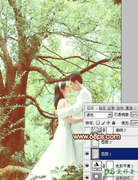 5、按Ctrl + Alt + 2 调出高光选区,按Ctrl + Shift + I 反选,新建一个图层填充暗褐色:#99987A,混合模式改为“滤色”,不透明度改为:30%,效果如下图。这一步适当增加图片暗部亮度。