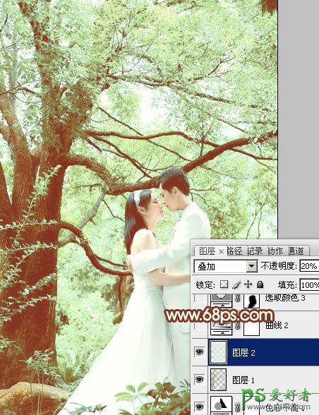 6、按Ctrl + Alt + 2 调出高光选区,新建一个图层填充淡绿色:#E2F0E3,混合模式改为“叠加”,不透明度改为:20%,效果如下图。这一步适当增加高光部分亮度。