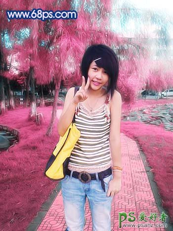 PS美女照片调色实例教程,PS给公园里的小妹妹照片调出梦幻紫色效果。本教程主要是借助通道来调色。从原图可以看出照片有点偏暗,可能是下午的时候照的。处理的时候先把照片处理清晰,然后再整体调色! 最终效果 原图 1、打开原图,创建色相/饱和度