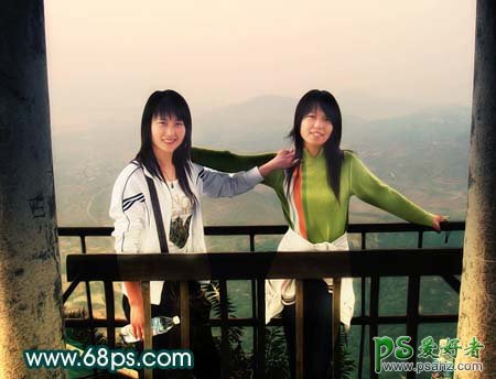 PS给风景区里的一对漂亮姐妹照片调出朝霞效果