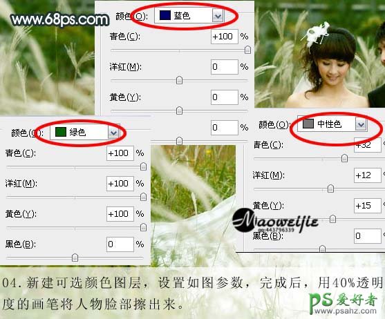 4、创建可选颜色调整图层,分别对蓝色,绿色,中性色调整,参数设置如下图,确定后用黑色画笔透明度为:40%左右把人物脸部擦出来。